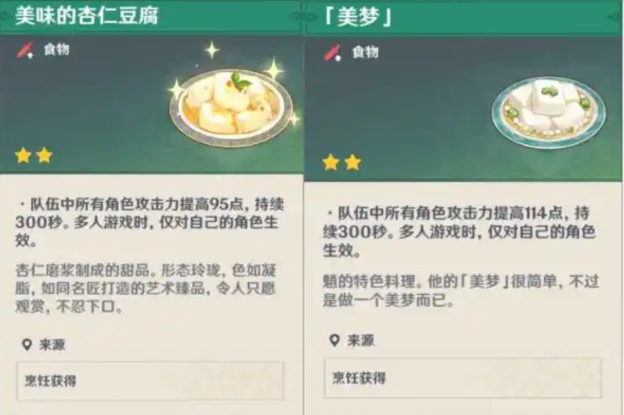 杏仁豆腐是一道二星品质的料理,能为队伍中所有角色提供攻击力加成。获取该食谱的主要途径是前往璃月地区的望舒客栈,在厨房与NPC言笑对话后选择想知道杏仁豆腐如何制作,即可免费获得配方。学习配方后,玩家需收集牛奶、糖和杏仁三种材料进行烹饪。