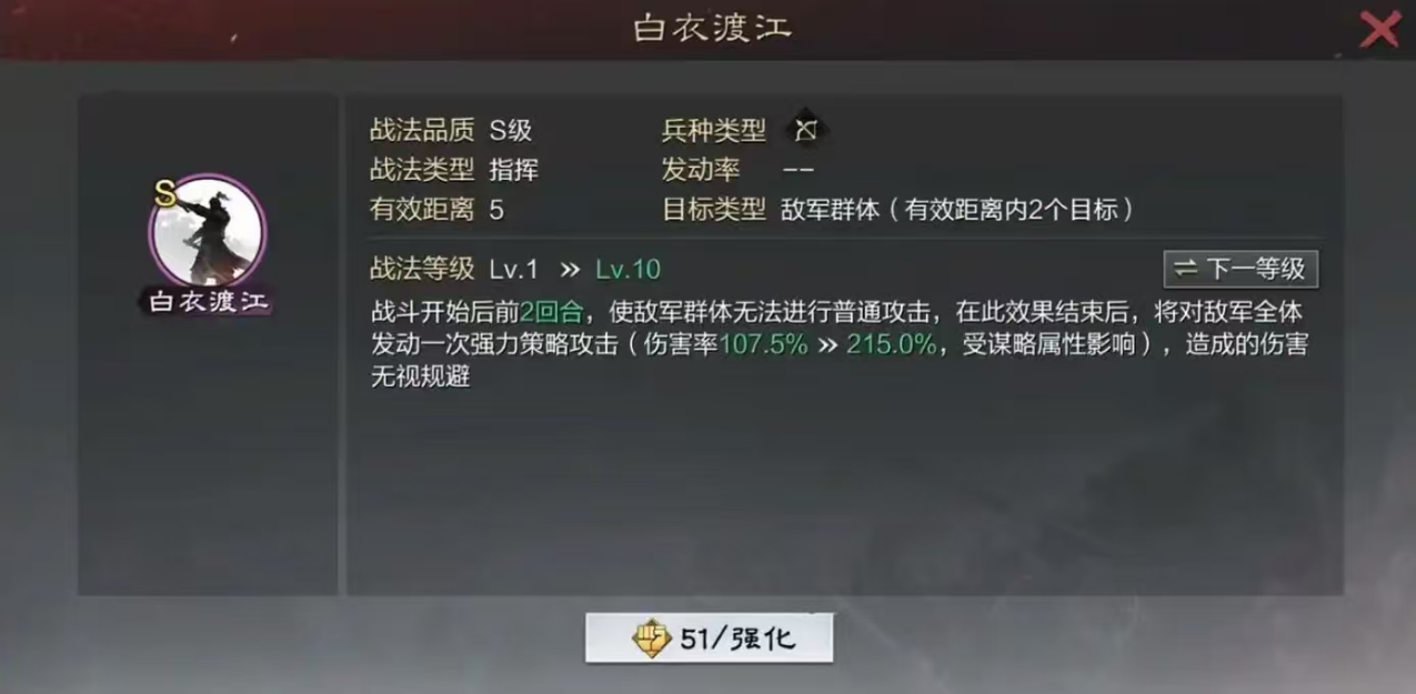 吕蒙的自带战法白衣渡江是关键控制手段,能有效封锁依赖普攻的武将,并为队伍争取输出时间。该战法第三回合的全体策略攻击可与神兵大赏的增伤效果叠加,形成爆发性伤害。孙策需配置长弓兵种以弥补攻击距离短板,配合曹操或陆抗的辅助效果实现五格普攻覆盖。吕蒙需全谋加点以最大化白衣渡江的伤害,而孙策的全攻加点则能强化先驱突击的连击收益。