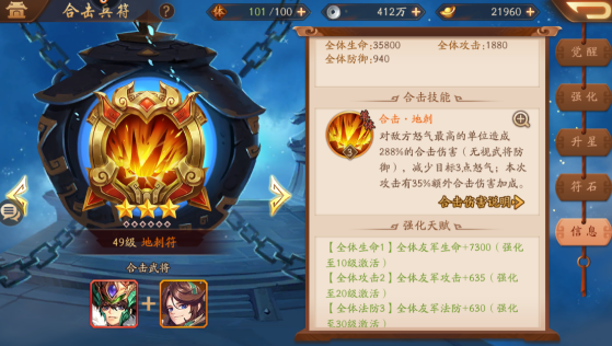 合击技能是提升战力的核心玩法,关键在于选择合适的兵符组合和释放时机。首先需要了解合击的触发条件:两名特定武将同时上阵并觉醒对应的兵符,同时积攒足够的怒气值。怒气值会随着武将攻击或被攻击逐渐增加,满足条件后就能手动释放合击技能。魏国的特色是控制与爆发,因此优先选择带有减怒、眩晕或群体伤害效果的兵符,比如寒冰裂符和地刺符,这些技能能有效打乱对手节奏。