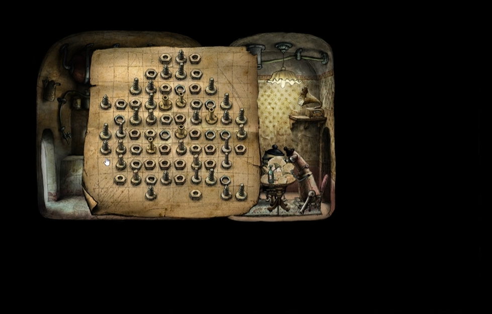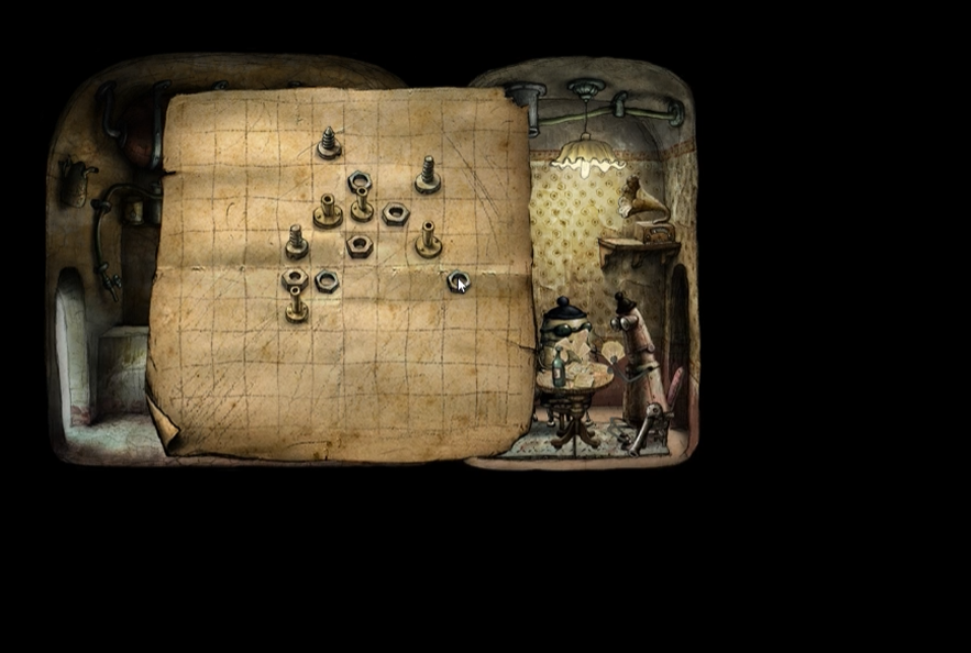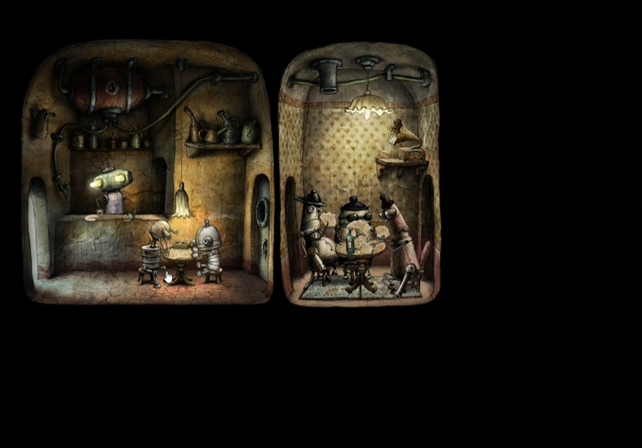 赢了棋局后别急着离开油店,在门口能找到一条胶带。拿着胶带去外面粘些苍蝇,回到油店对着老板使用,趁他赶苍蝇时偷走油桶。这油桶要交给鼓手机器人,他会用油修理自己的鼓。这时候楼上会扔下花盆,记得把花盆里的植物收好,后面还有用处。