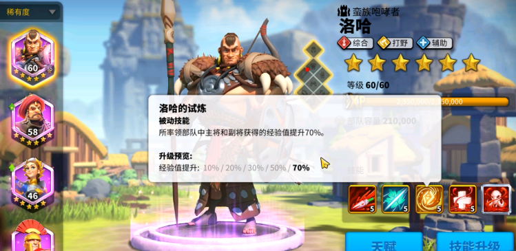 凑齐10个洛哈的雕像碎片后,咱们就能召唤英雄洛哈了。不过打野蛮人时尽量选择等级高的,这样掉率会更高。打野英雄的天赋记得点出洞悉,这样可以减少体力消耗,提高效率。如果体力不够了也别急,背包里的体力药水或者VIP商店的体力药水都可以用,但钻石买体力就不太划算了,毕竟这个活动没有排名奖励,慢慢来就行。