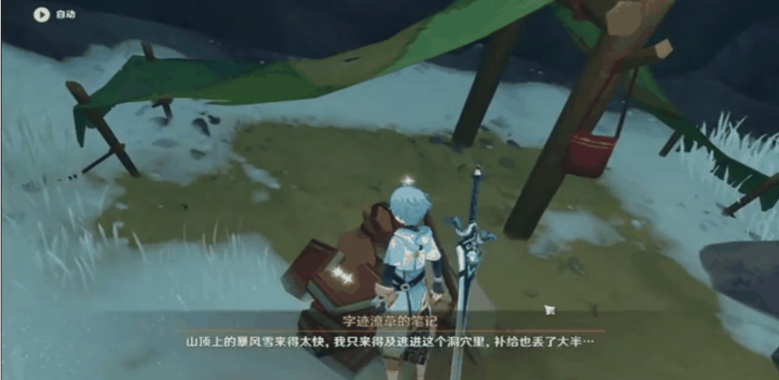 从七天神像直线前进,进入洞穴后右转,用双手剑或爆炸攻击破坏石墙,后方营地内可找到最后一本笔记。笔记内容显示乔尔父亲因暴风雪受困,最终选择从悬崖撤离。至此任务线索收集完成,需返回向乔尔汇报。