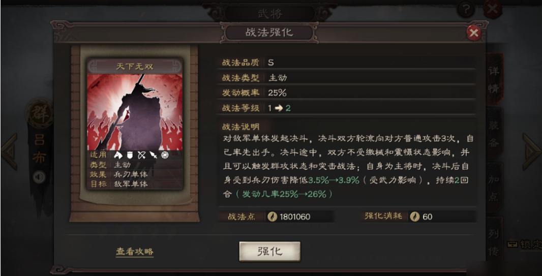 吕布的强度绝对对得起他的稀有度,武力成长全游戏最高,自带战法天下无双能在决斗中打出爆炸伤害。他的兵种适性也很优秀,骑兵和弓兵都是S级,所以组队时优先考虑这两种兵种。如果想让他发挥最大作用,记得搭配增伤或保护型武将,比如郭嘉、黄月英,这样能让他更稳定地输出。