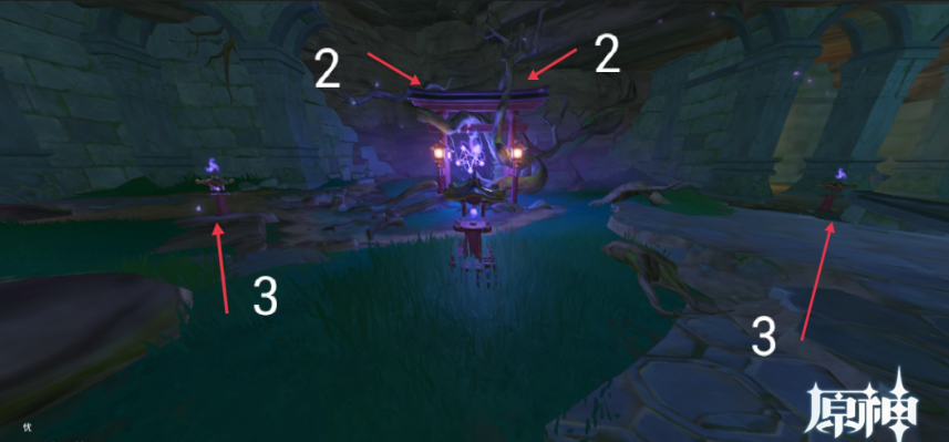 在荒海海底世界的探索过程中,需要先找到荒海中间大树旁的三根雷柱,跳到中间圆柱下去可以到达地底。进门就可以看到神樱大祓的任务,顺序是前1,左3,左上2,右3,右上2。右手边是一个大门,需要解锁两个仙灵,一个仙灵在柱子上,另外一个仙灵在大祓树的左边。把左边机关过完可以获得一个宝箱,旁边有个水潭,下去一直游可以发现五个机关,解锁后水位会下降。