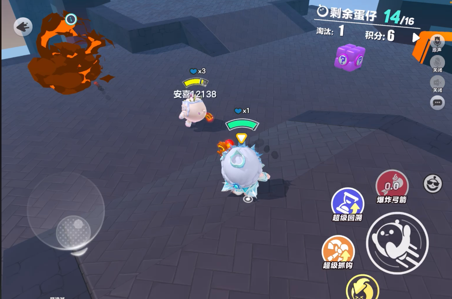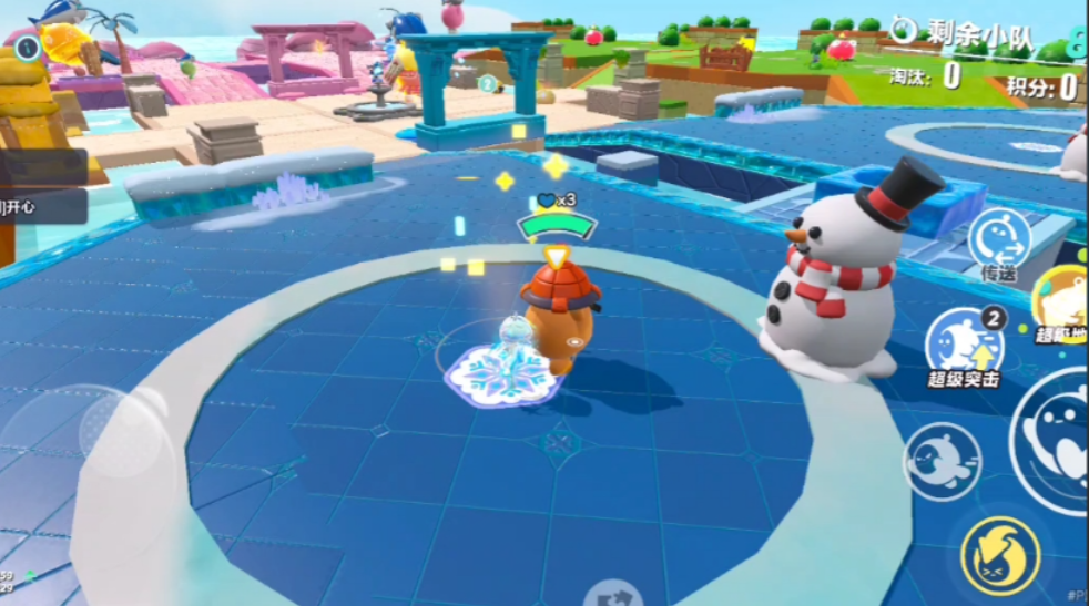 地图上会刷新爱心和攻击类道具,爱心能回血,火箭筒、炸弹这些则能干扰对手。决战技强化后效果超给力,比如超级巨大化能弹飞周围对手,超级雪球可以冻住一片人。建议留一个加速类道具应对突发情况,比如滑板或气球,被围攻时能快速脱身。别忘了捡特殊道具羽毛,它能减少70%重力让你飘在空中,躲沉岛特别好用。