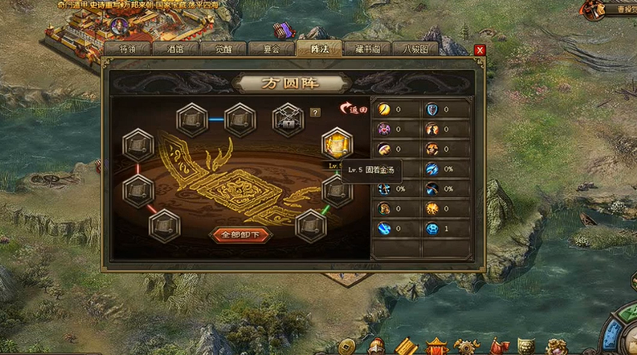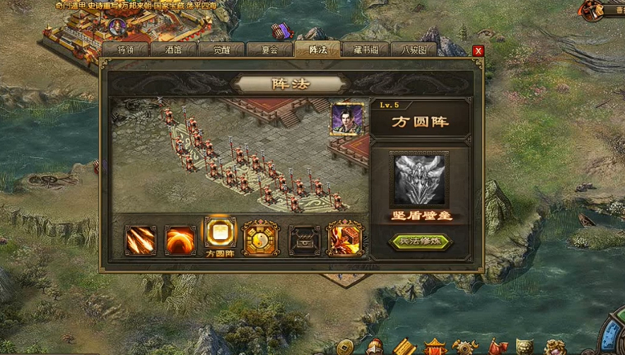 激活阵法后,在国战或副本中需手动切换至方圆阵模式。战斗中首排放置防御型武将吸收伤害,后排输出单位可依靠减伤效果持久作战。定期升级阵法等级(最高10级),每级提升2%全兵种防御。若遇到高爆发对手,可临时调整为锋矢阵突击克制。