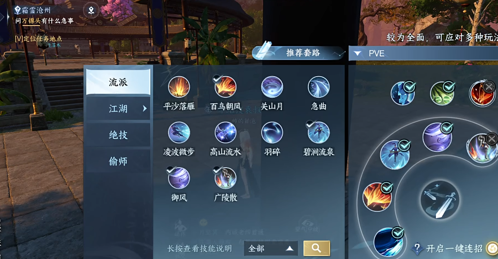 PVE场景下推荐携带广陵散、平沙落雁、百鸟朝凤、御风组成火风双修流派,江湖技能选择心眼无量和兵锋现世提升输出上限。内功搭配以3金3火为毕业标准,追求极致爆发时可选用摧锋、折锐等输出型内功。PVP方向则需调整技能组合,高山流水与凌波微步成为必选,前者提供直线冰冻控制,后者具备解控位移功能。3V3对战中建议采用3火3土内功配置,搭配楚狂歌等生存型特质增强容错率。