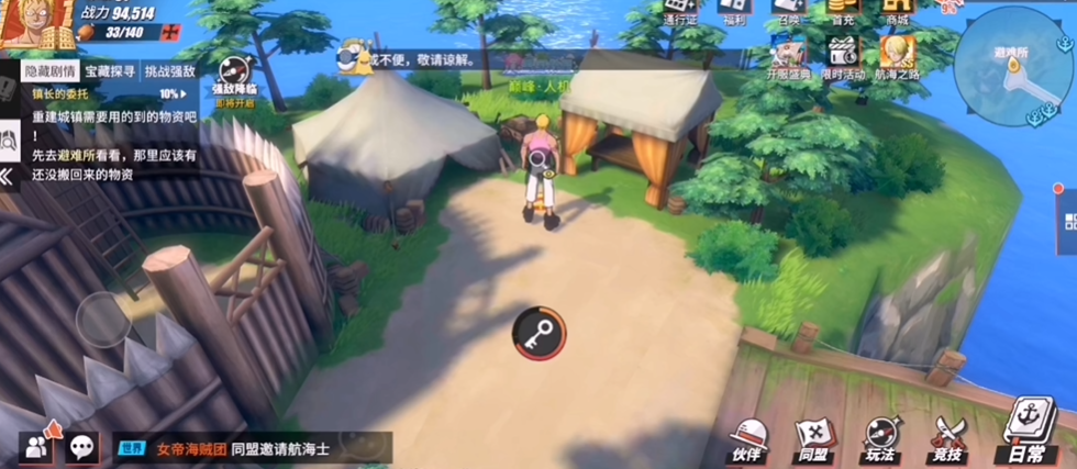 认识小狗秀秀任务需前往西区宠物店与秀秀互动,对话后获得奖励。随后需进入东边仓库击败巴基残党,战斗难度较低,适合新手熟悉操作。营救海盗船长任务需出海至无名海岛,与海盗队长对话后寻找三名船员,再前往珍兽岛击败海军并返回领取宝藏。宝箱密码均为2054,分布在伐木场、民居及巴基大本营楼顶,需按日记线索逐一解锁。