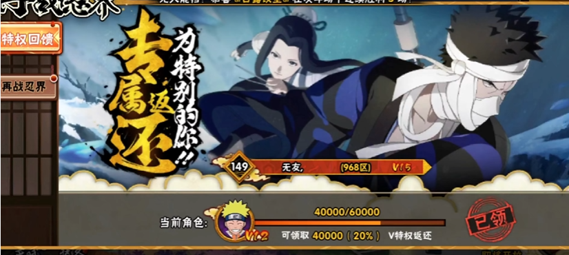 再战忍界是一项针对老玩家回归或转战新区的特殊活动。触发该活动需要满足特定条件:当前账号在之前任意区服中必须拥有一个50级以上的角色,且在新创建角色时会自动激活再战忍界。活动期间完成每日任务可连续领取7天金币奖励,奖励金额与老区账号的VIP等级正相关,VIP等级越高每日获得金币越多。