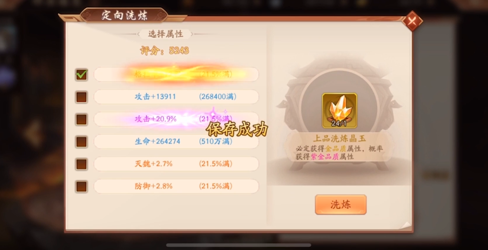 洗练分为普通洗练和定向洗练两种方式。普通洗练完全随机,适合前期快速调整属性;定向洗练可以针对特定属性优化,但消耗更多资源。如果洗出不满意的属性也别急着覆盖,可以通过属性交换功能将这条属性转移到其他神兵上,避免浪费。洗练称号会根据激活的条目数量变化,称号效果仅对当前武将生效,主角无法享受阵营相关的抗灭属性加成。