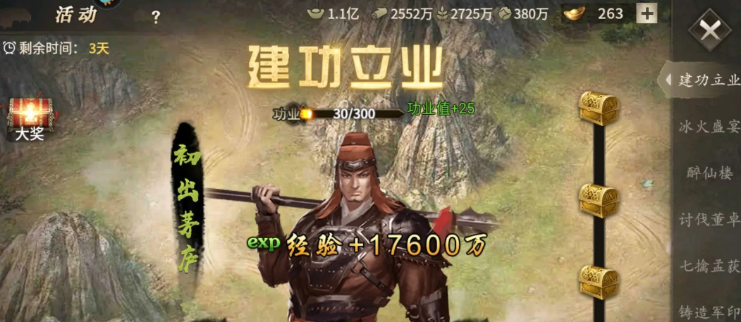 建功立业活动是获取兵书和物资的重要途径,参与方式很简单,在游戏里直接打开最后一个活动列表,找到建功立业入口即可。活动界面有三个主要按钮:砥砺文武、巡镇安民和征战天下,分别对应不同功业值和奖励。每次参与需要消耗行动次数,系统每天会提供9次免费机会,用完后需要花费金币继续参与。完成300功业值就能开启宝箱领取奖励,随着完成轮数增加,右侧宝箱奖励也会逐步提升。