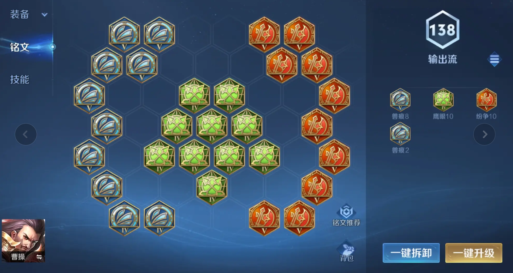 曹操的被动技能让他释放技能后可以提升攻速,所以他很依赖攻速和物理穿透属性来打出更多普攻并快速回血。通常推荐的铭文组合会包含增加攻速的狩猎、增加物理穿透的鹰眼,以及增加攻击力和生命的宿命或异变。
