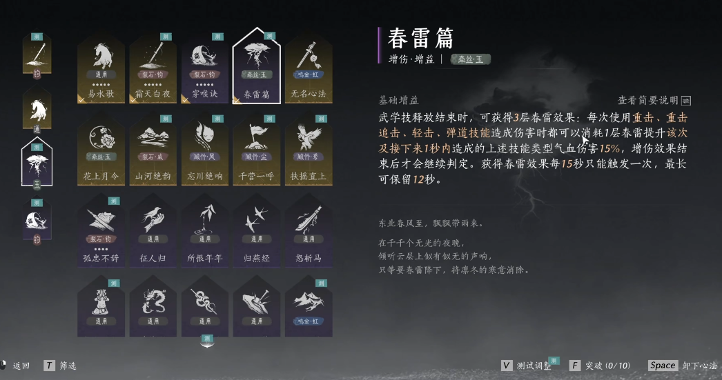 将春雷篇融入整体战斗构建时,需考虑其定位。它提供的是一次性的、条件触发的可观伤害加成,这决定了它更适合作为伤害补充手段,而非构建的基石。玩家应将其视为在熟练走位和把握战斗间隙中附赠的额外伤害。游戏进程推进,当玩家获得了更强大或更契合其终极流派的心法后,可以考虑将其替换。
