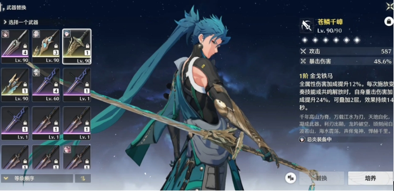 武器选择直接影响忌炎的输出能力,专武苍鳞千嶂与忌炎技能高度契合,能大幅提升攻击力和暴击伤害;四星武器纹秋是可行的替代品。声骸套装首选啸谷长风五件套来强化气动伤害和重击效果,过渡时期可用2件啸谷长风与2件不绝余音,主词条优先选择暴击率、气动属性加成和攻击力,副词条侧重暴击、重击伤害和攻击力加成。