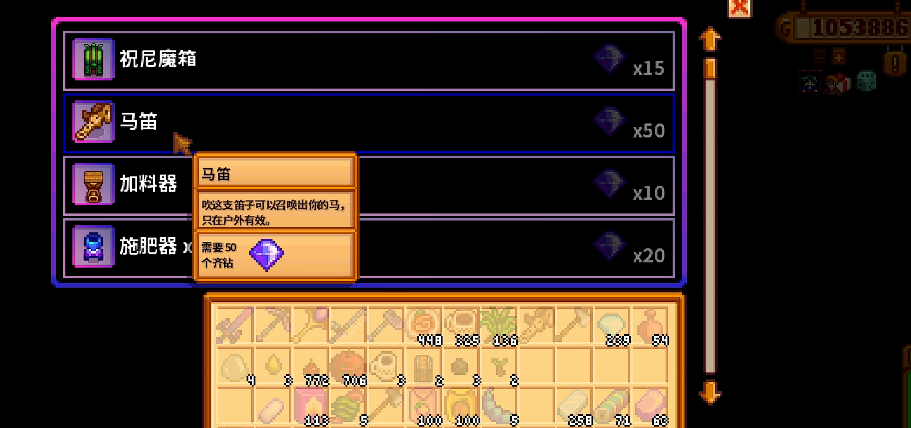 拿到齐钻后,最值得优先投资的物品非马笛莫属。这件道具能让你随时随地召唤坐骑,无论你身处矿洞深处、偏远的姜岛还是自家农场,一声令下马匹便会瞬间出现在身边。这极大地提升了你在广阔星露谷地图上的移动效率,节省下大量奔波赶路的时间,让你能把更多精力投入到种植、钓鱼或下矿等核心活动中去。可以说,马笛是能全方位优化你游戏体验、且早期就能带来巨大便利的功能性神器。