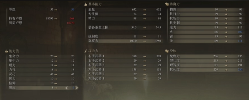 进入游戏的中后期,你的属性框架应当逐步丰满。在确保能拿起核心武器后,目标是将力量、灵巧和血量三者都平衡到20点。达成这一基础后,可以优先将血量进一步提升到25点,以应对更猛烈的BOSS战。此后,加点重心应完全偏向灵巧,力求尽快将其推至50点甚至60点,期间可穿插将力量补充至25点。这个阶段,你的伤害会灵巧增高而有质的飞跃。与此你需要开始管理你的专注值(蓝条),如果频繁使用居合、鲜血斩击等强力战技,就需要适当分配点数到集中力上,确保有足够的蓝量支撑你的战斗节奏。