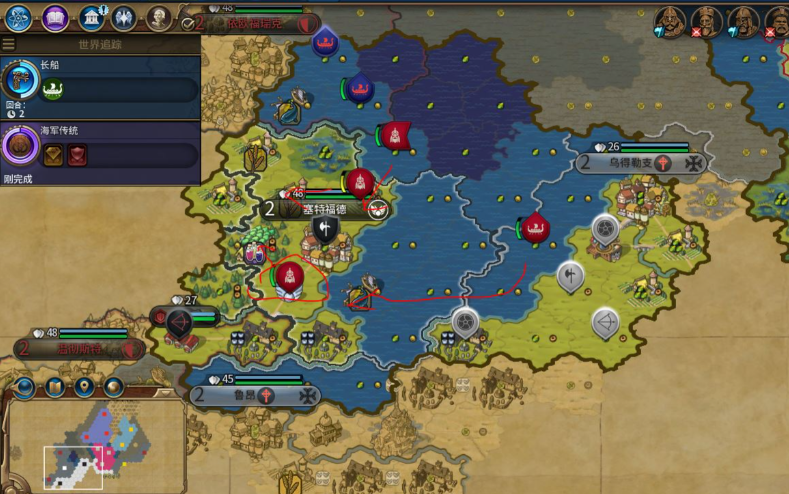挪威的文明特性决定了其在海洋地图上的统治力。其特色单位维京长船在远古时代即可解锁,不仅战斗力高于普通桨帆船,在海岸地格的移动力也更为出色,并且所有海军近战单位都拥有劫掠相邻沿岸地格的能力,这使其在游戏早期就能扮演高效的海上掠夺者角色。挪威的所有陆军单位登船和登陆时不需要额外消耗移动力,这使得其陆军在复杂的岛屿地形中能够进行高效的水陆转换和灵活机动,避免了被地形卡死的窘境。