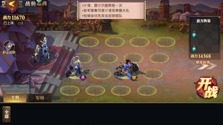 在武将选择上也有讲究,应当采用2弓手、1盾兵加1步兵的组合,其中盾兵必须选用1星的袁术,而不是星级更高的黄盖,布阵时将袁术和步兵主将并列放在前排,弓手放置在后排输出位置,实战中发现将盾兵调整到战场右上角,能更有效地让敌方骑兵聚集。