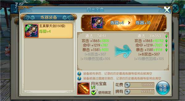 说到使用技巧,建议小伙伴们不要急着兑换道具。器灵值积累到一定程度后,炼器成功率会明显提升,这时候再出手效果更好。兑换道具时要根据当前需求来选择,比如冲击高等级装备可以优先换月光宝盒,平时稳定提升的话天缘符就很划算。记住每周只能使用一次月光宝盒,这个限制要特别注意。