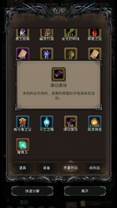 律动黑铁是咱们在遗迹远征模式中能获得的稀有道具,主要用来兑换各种强力圣物装备。攒够100个就能找城堡里的工匠巴隆兑换,比如皇族长柄斧、帝王战斧、泣血巨人这些高级装备,品质越好的圣物需要消耗的黑铁数量也越多。兑换时记得看清楚条件,有些装备需要特定进度或前置任务才能解锁。