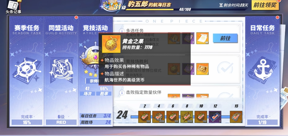 金果作为高级货币,可用于招募伙伴、购买体力等核心玩法。获取途径虽有限,但通过系统化规划仍能稳定积累。船舱每日产出15金果,竞技场首胜奖励30金果,周胜宝箱累计300金果。段位奖励需关注达人二阶段,赛季结算时可重复领取。推进城击杀任务、海岛争霸周末分数奖励均提供稳定收益。强敌降临附近的漂浮木桶与宝船刷新点每日可拾取少量金果,需优先清理。
