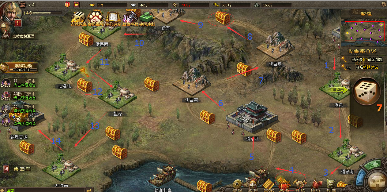 资源分配要均衡,别把所有骰子砸在一座古城。楼兰的粮食和经验适合前期发育,敦煌的点券和宝石中后期更实用,若羌的精炼和马踏飞燕碎片则是长期投资。每天登录和整点领取的骰子别浪费,存够一定数量再集中冲刺,避免分散使用导致奖励拿不全。御宝系统在171级开启后能大幅提升战力,提前攒好御宝图纸和资源很重要。