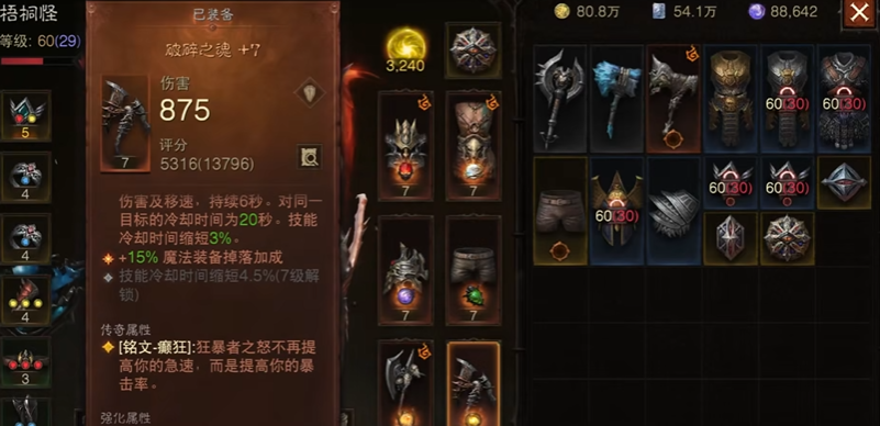 野蛮人优先强化攻击力与生存属性。传奇装备如疯狂者(主武器)、碎破之魂(副武器)可提升技能效果;盛怒狂风胸甲和愤怒尖啸护腿能增强范围伤害。宝石镶嵌以红孔伤害宝石、蓝孔破甲宝石为主,黄孔可选控制增强宝石。绿色套装推荐沙巴斯系列,其攻速加成效果可弥补野蛮人普攻速度不足的缺陷。