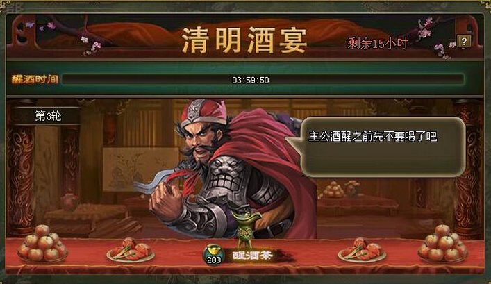 活动酒是参与限时玩法的关键资源,例如煮酒论英雄活动中,积累醉意值可进入酒兴正酣状态,使觉醒效果翻倍。美酒通常通过完成世界事件或活动任务随机掉落,需根据活动目标选择投入数量。优先参与高回报活动,如提供稀有兵书或宝石奖励的玩法,避免资源浪费。同时注意活动酒的存储上限,及时使用以防溢出。