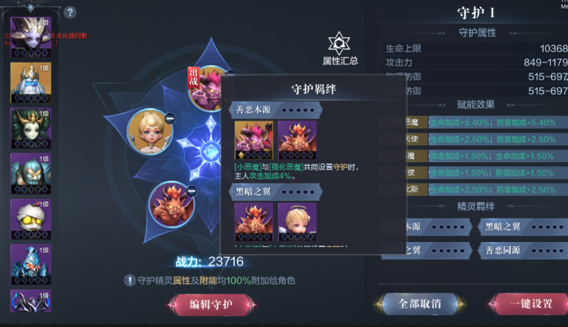 精灵守护功能能让你的实力大幅提升,只要在界面里设置好想要参战的精灵,它们的属性就会完全附加到主角身上,同时激活守护羁绊后还能按百分比提升角色属性,星级越高的精灵带来的加成就越明显,角色成长还能解锁更多的守护阵位,让你的冒险之旅更加轻松。