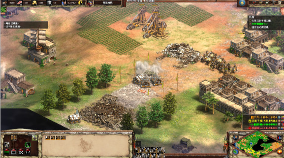 开局阶段你会在上下方各拥有一个基地,上方的基地邻近俄罗斯,下方的则靠近波斯,资源分配上需要有所侧重。初期发展应优先保障食物与木材的采集,以快速训练村民并建立基础经济,开局拥有的初始骑兵应立刻向东南方探索,找到并摧毁保护贸易马车的石墙,护送其返回基地以获得关键的黄金补给。经济初步稳定后,应尽快在基地附近建造马厩等军事建筑,同时安排村民开采金矿与石矿,并在外围修建防御塔楼以防范敌人的早期偷袭,为后续时代升级和军事行动打下坚实基础。
