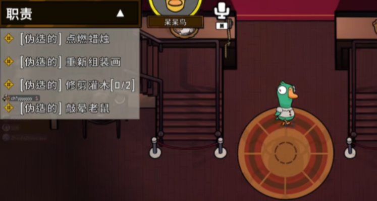 为了实现被票出局的目标,呆呆鸟本身没有任何主动攻击或破坏的技能,甚至连游戏中的任务也都是虚假的,仅用于伪装自己。玩家的全部精力都应放在行为表演和发言引导上。基本策略就是刻意模仿坏人的行为模式来制造嫌疑,例如在游戏过程中频繁脱离大部队单独行动、在尸体被发现前后故意出现在可疑区域徘徊但不主动报告、或者前往鸭子专属的任务点假装做任务。这些反常举动都是为了激发好人阵营的警惕与怀疑,让他们在开会时将你列为重点怀疑对象。