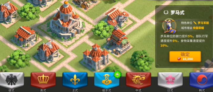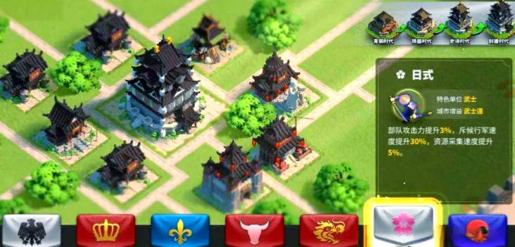 建筑风格与文明选择紧密相连,直接影响兵种加成、资源采集和行军速度等核心玩法。游戏提供了多种历史文明风格,每种都附带独特的增益效果,例如埃及式提升弓兵攻击力和集结伤害,维京式强化步兵单位与部队负载,日式增加全兵种攻击和行军速度。这些风格不仅塑造城市外观,更决定了玩家在发展、战斗中的优劣势,因此选择时需结合自身战略偏好。