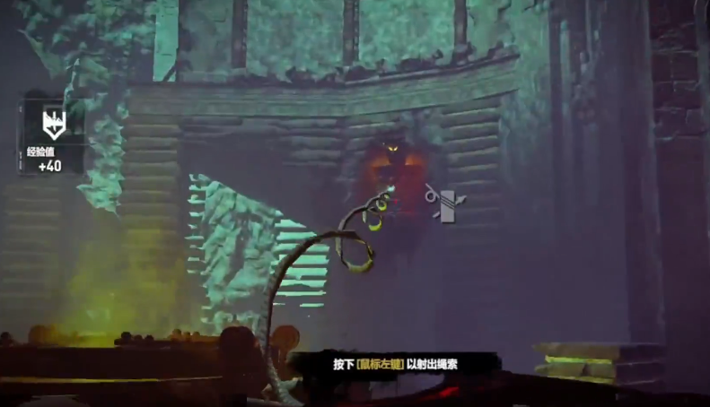 邪恶溪谷的另一项挑战在于收集高处的文献。这份文献位于一个由绳索控制的移动木板上方,获取过程对时机要求较高。玩家需要先瞄准并固定控制木板的绳索,然后迅速跳上木板。由于绳索固定的有效时间有限,玩家在木板上必须保持镇定,等待木板摆动至与目标高台垂直对齐的最佳时刻,抓住时机果断跳跃至对面,并继续前进。整个过程需要在有限时间内完成连续动作,任何犹豫都可能导致失败,因此路线规划和跳跃时机的判断尤为重要。